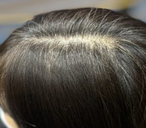 白髪は太くてキューティクルが強く閉じてるので、そこにしっかり色を入れないといけないため、強い薬剤でしっかり開き染料を入れていきます。